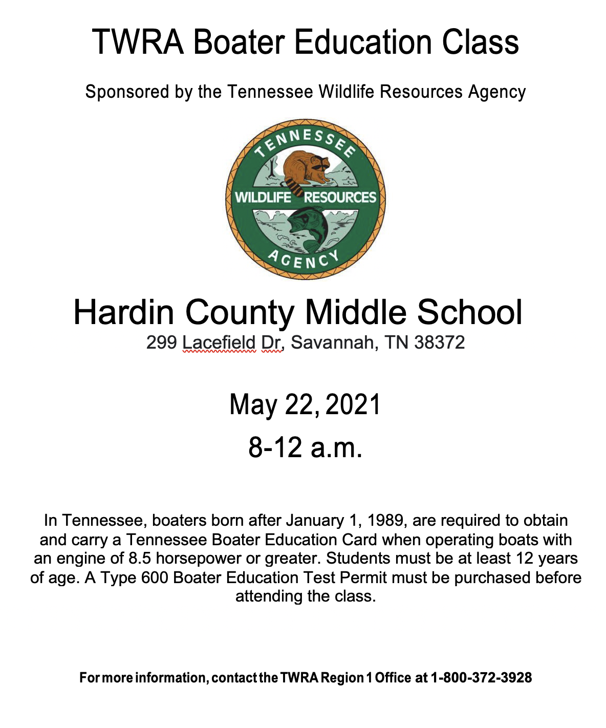 In Tennessee, boaters born after January 1, 1989, are required to obtain and carry a Tennessee Boater Education Card when operating boats with engines of 8.5 horsepower or greater. Students must be at least 12 years of age. A Type 600 Boater Education Test Permit must be purchased before attending the class.